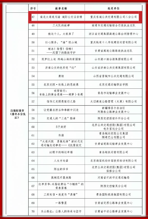 自活動啟動以來,公司領(lǐng)導(dǎo)高度重視,龍盛經(jīng)營部積極響應(yīng),在市交通運輸委、市道路運輸事務(wù)中心、渝北區(qū)交通運輸委、渝北區(qū)道路運輸事務(wù)中心和物流集團的關(guān)心、幫助與支持下,經(jīng)組委會材料初篩、活動初選,東城公交川渝20路好故事《南北大道連川渝 城際公交話親情》成功入選百強好故事,使東城公交在成渝雙城經(jīng)濟圈建設(shè)中的積極作為得到了有效展示。